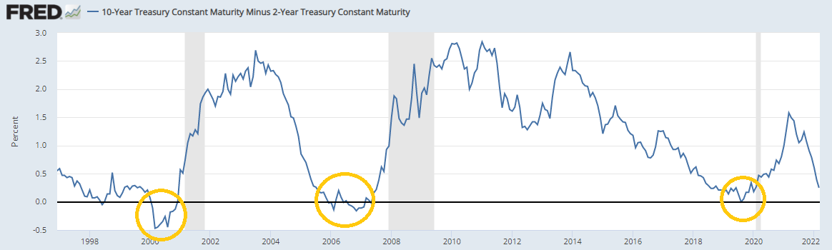 우선 2000년 초에서 2001년까지의 기간 동안 장단기 금리차가 크게 역전되었던 것을 볼 수 있었습니다. 생각보다 긴 시간 동안 역전이 되었죠. 그 후에는 2006년과 2007년에 장단기 금리차가 역전되었고, 마지막으로는 2019년 8월경에 잠시나마 장단기 금리차가 역전되는 일이 발생했었습니다.