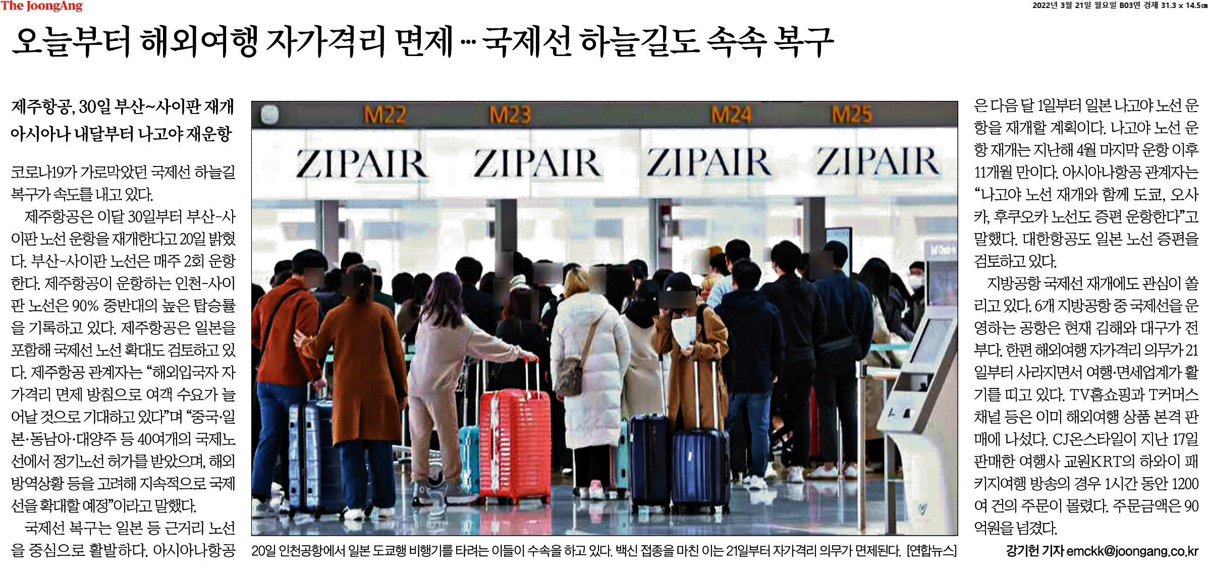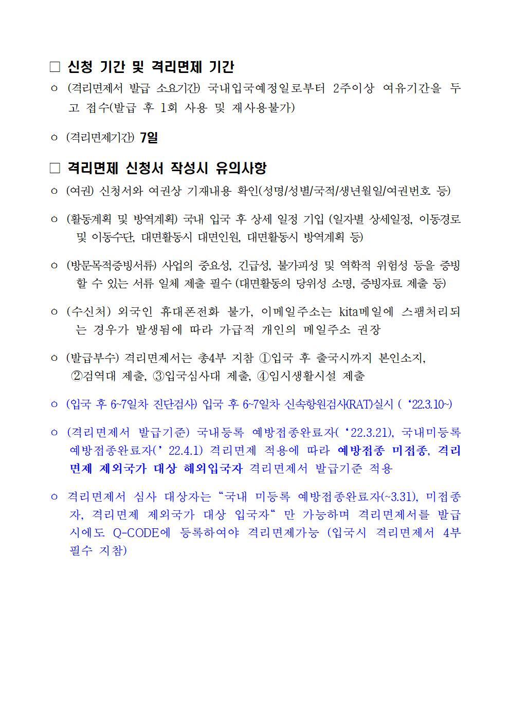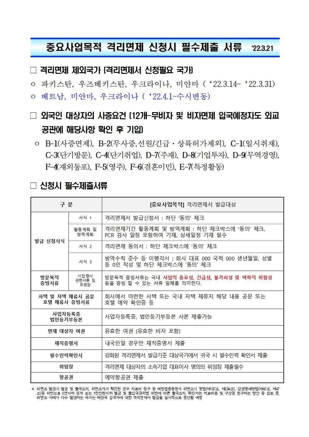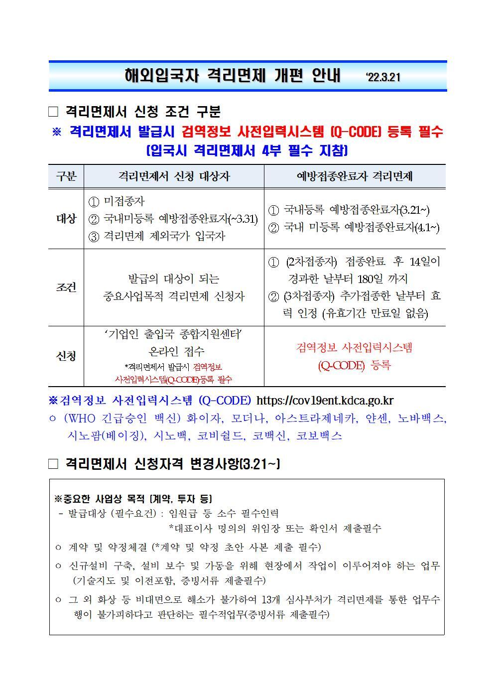 해외입국자 격리면제 개편안내 ('22.3.21)