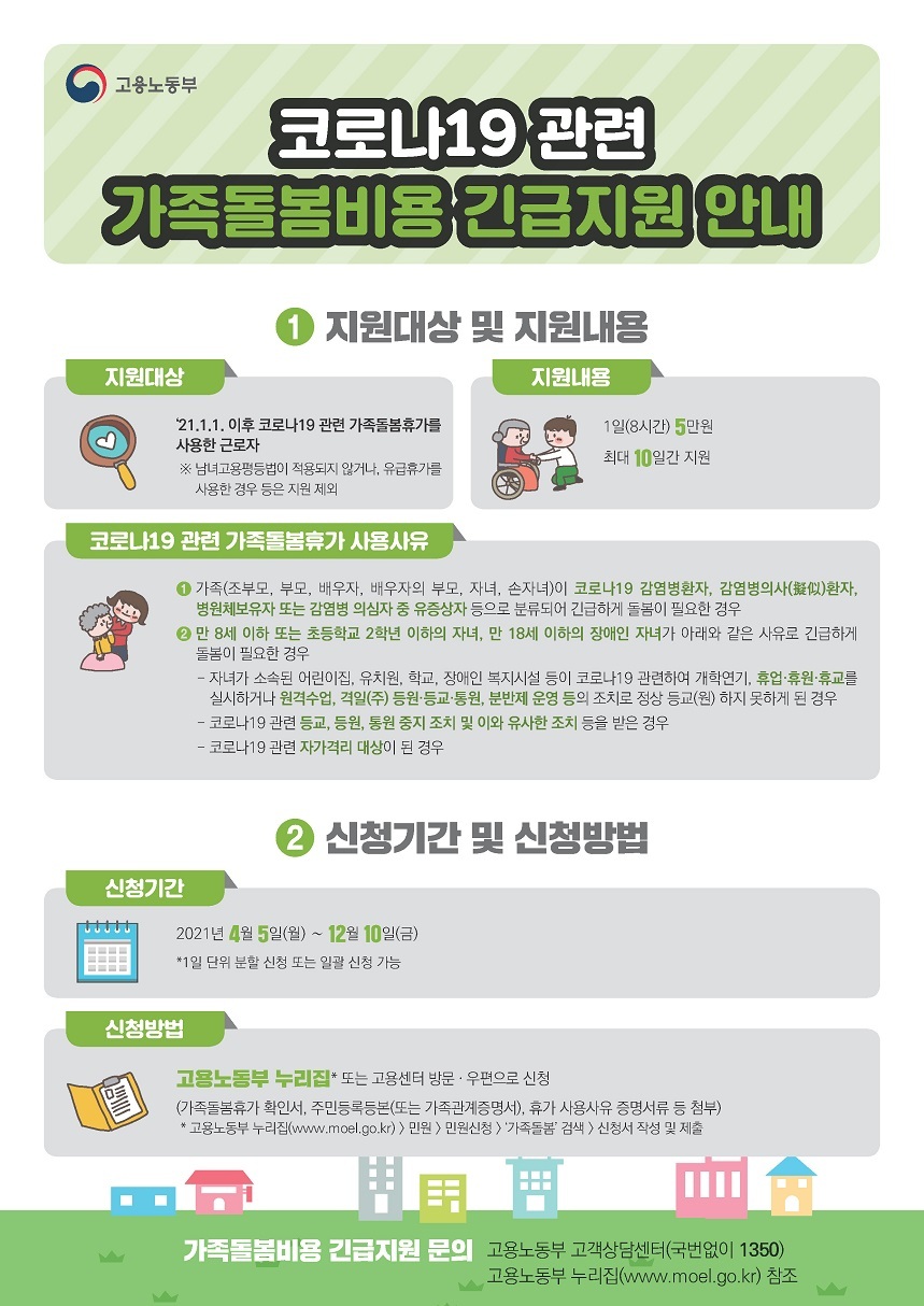 가족이 코로나19에 확진됐을 때 ‘가족돌봄휴가’를 사용한 근로자에게 하루 5만 원, 근로자 1인당 최대 10일간 지원합니다. 고용노동부가 어제부터 시행한 지원사업으로 올해 1월 1일 이후 가족돌봄휴가를 사용한 근로자라면 신청할 수 있어요.