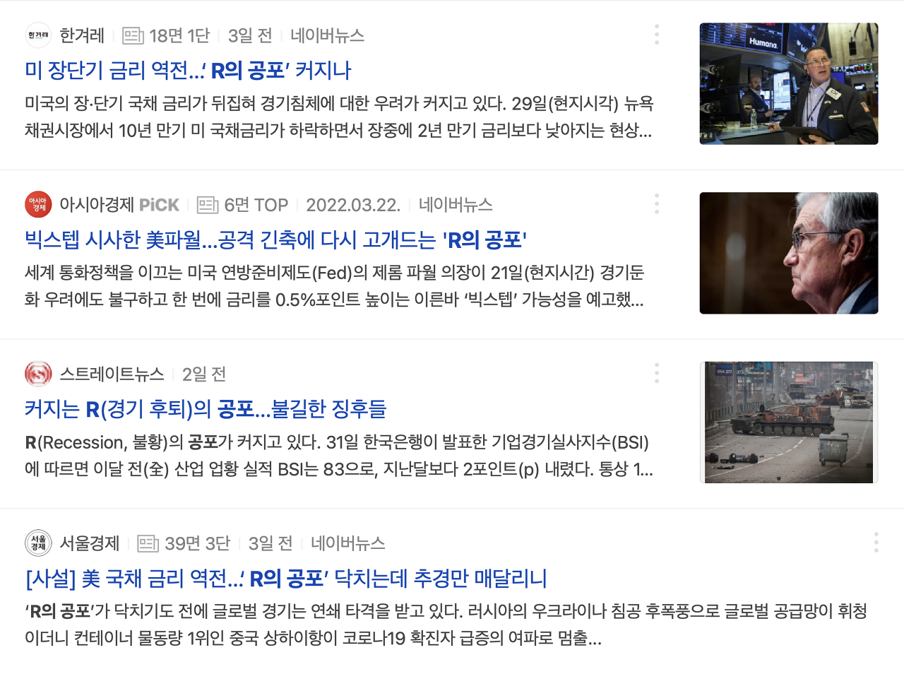 이런 현상이 발생했을 때 대개 경기가 후퇴, 즉 침체됩니다. 그래서 ‘후퇴(Regression)’의 공포, ‘R의 공포’가 시작됐다고 말하곤 해요.