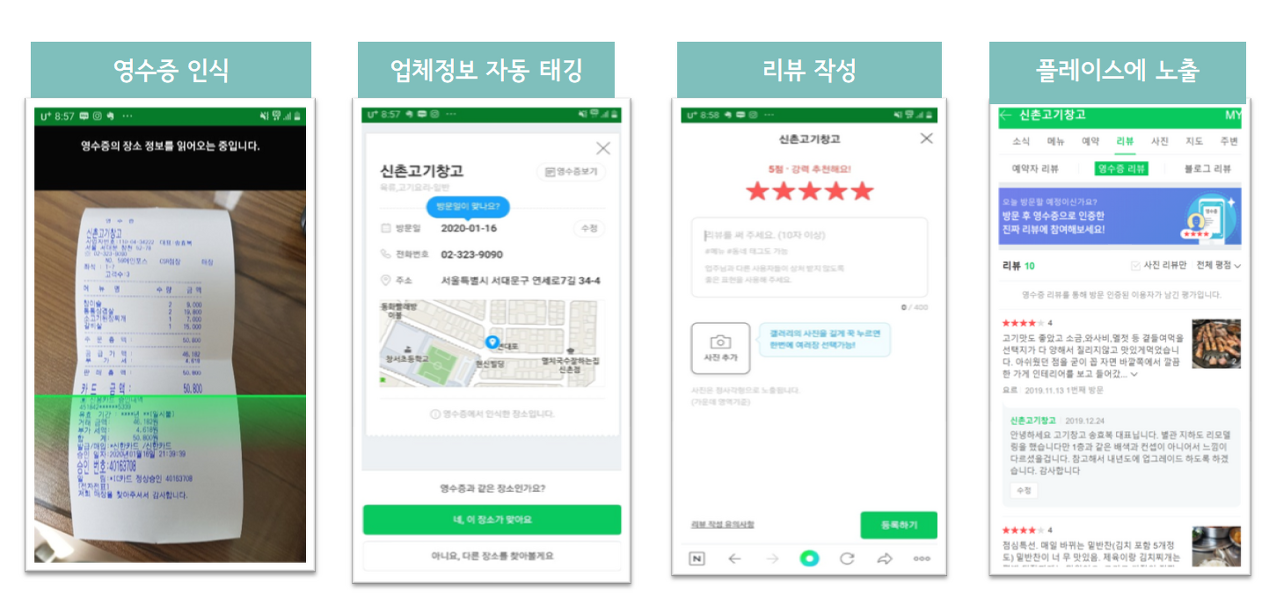 오프라인 가게에 대한 정확한 데이터를 쌓는 데 목적이 있다. 영수증을 기반으로 한 이용자들의 명확한 리뷰를 통해 이용자들의 오프라인 쇼핑 데이터를 확보가 가능해짐.