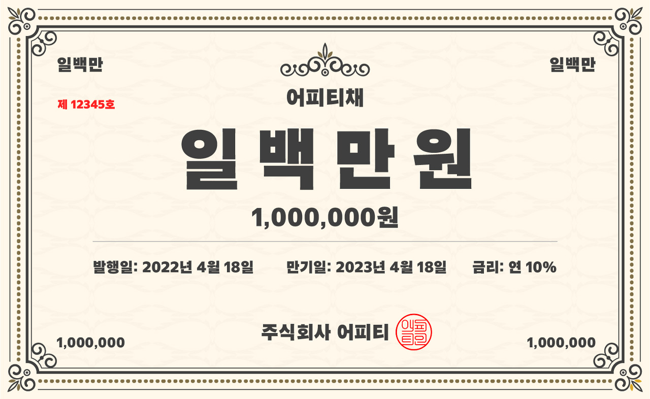 예시:어피티가 채권 공부를 위해 회사채를 한 장 발행했습니다.