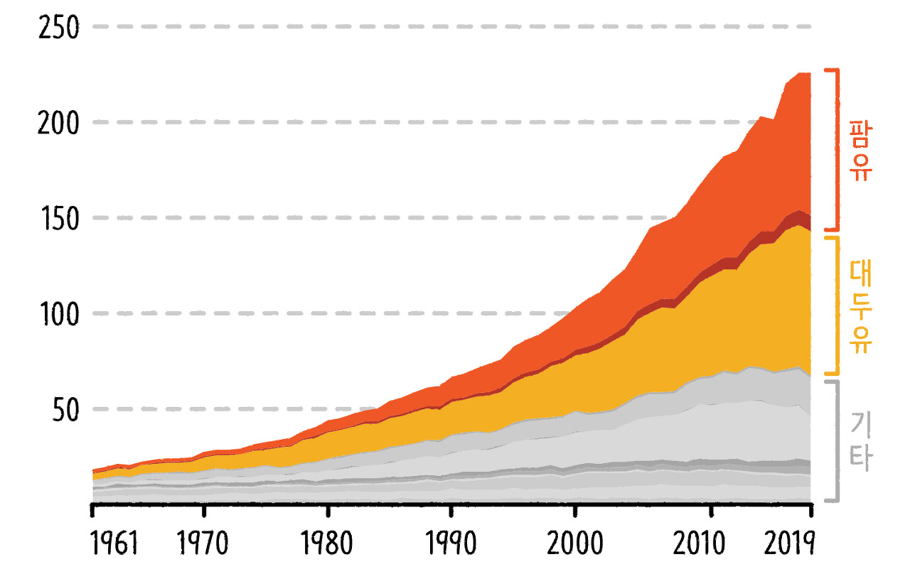 팜유는 원래 서아프리카에서 주로 재배했어. 1960년대의 생산량을 비교해보면 나이지리아와 콩고 공화국이 상당한 부분을 차지하거든. 말레이시아에선 곤충을 통한 수분 기술이 도입된 1970년대부터 생산량이 크게 증가했어. 거기에 정부 차원에서 빈곤 퇴치 수단으로 팜유 사업에 뛰어 들면서 그 규모가 크게 확장됐지. 기름을 추출하는 기술에 막대한 투자를 하고, 팜유 농가에 세금 혜택을 주기도 했어. 국제 사회에서도 말레이시아와 인도네시아의 팜유 생산에 큰 관심을 보이고 과세를 없애주거나 대출 지원 등 금융 혜택을 주면서 산업이 급속도로 커졌어.