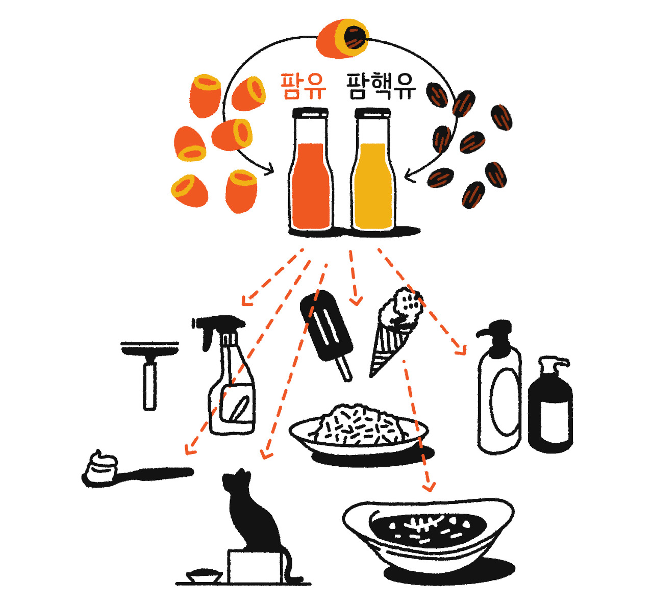 팜유의 활용범위 : 팜유는 고온으로 가열해도 잘 변하지않고 오랫동안 보관해도 산화X -> 튀김요리만드는 기름으로 적합 (ex.식품, 라면, 과자, 마가린 쇼트닝의 원료, 초콜릿 만들때, 치약, 샴푸, 립스틱, 비누, 액상세제...)