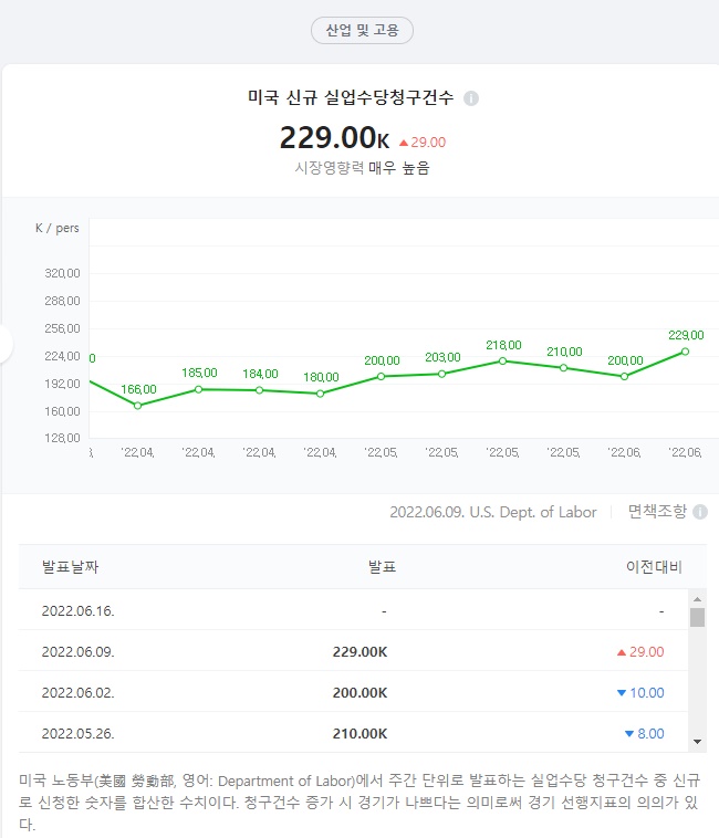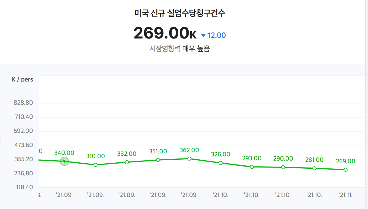 미국 노동부에서 매주 목요일마다 사람들이 한 주간 실업수당을 얼마나 새로 신청했는지를 발표하는 통계입니다.