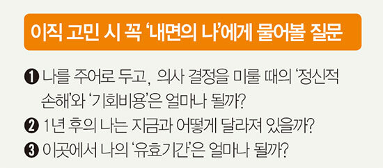 첫째, 나를 주어로 두고, 의사 결정을 미룰 때의 ‘정신적 손해’와 ‘기회비용’은 얼마나 될까? 지금 당장 받는 월급이 ‘매몰 비용’이 될 수 있는 것은 아닐까?