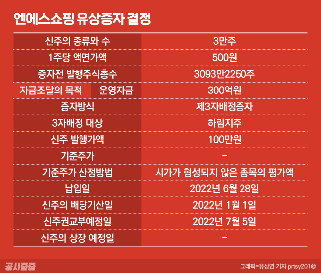 다만 NS쇼핑은 권리내용이 유사한 기업을 찾기 어렵고 장외시장에서도 거래가 이루어지지 않고 있기 때문에 이사회 결의로 신주발행가액을 결정했어요. NS쇼핑은 유상증자 공시를 통해 신주발행가액을 "발행인인 엔에스쇼핑과 청약인인 하림지주 간의 합의 및 이사회결의에 따라 산정"했다고 밝히고 있어요.