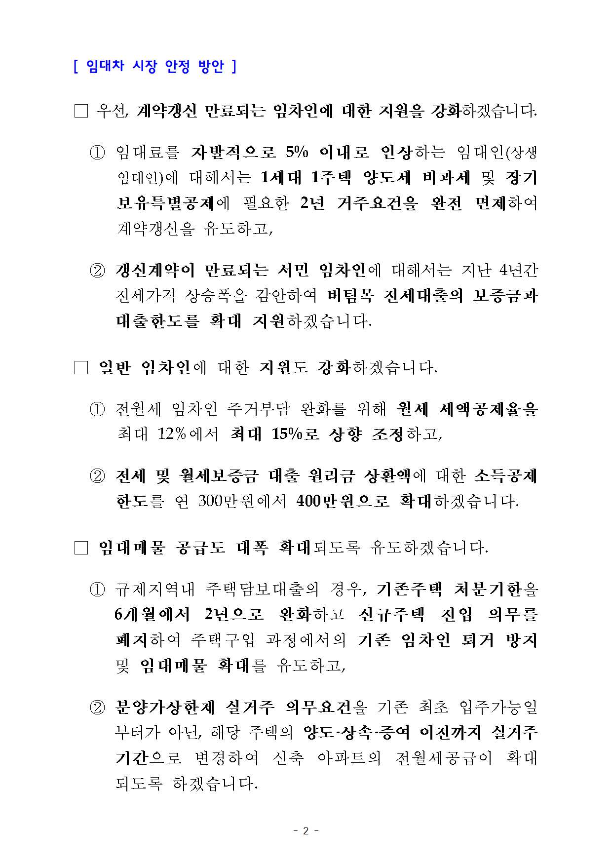 정부는 올해 말 종료 예정이었던 상생 임대인 제도를 2024년 말까지 연장하고, 조정대상지역 1세대 1주택 양도세 비과세 2년 거주 요건을 없앤다. 또 2년 거주 요건 없이 1세대 1주택 장기보유특별공제를 적용해준다. 임대개시 시점에 다주택자이지만, ‘향후 1주택자 전환 계획이 있는’ 임대인에게도 혜택을 적용할 방침이다.