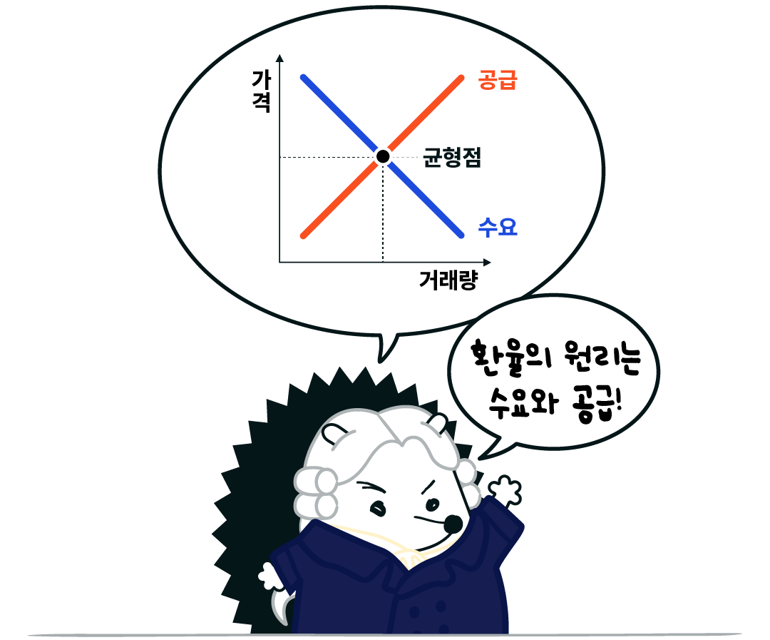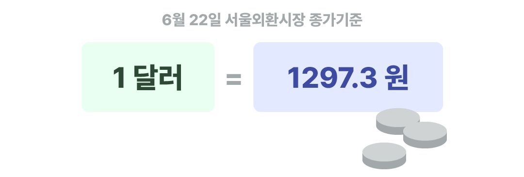우리나라 돈을 다른 나라 돈으로 바꿀 때의 비율이에요. 원·달러 환율은 한 마디로: 1달러($)를 사는데 필요한 원화(₩)의 양인데요. 전 세계에서 달러가 제일 많이 거래되다 보니 보통 환율 하면 원·달러 환율을 말해요. 환율은 수요와 공급 원리에 의해 정해져요. 무슨 말이냐면: