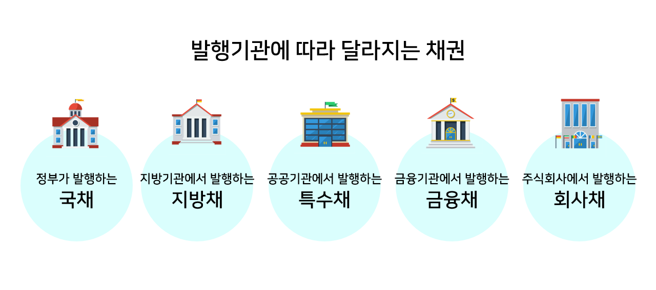 채권은 아무나 발행할 수 있는 건 아니고, 발행자격을 갖춘 기관을 법으로 정하고 있는데요. 일반적으로 정부, 공공기관, 은행, 주식회사 등에서 투자자들로부터 자금을 조달하기 위해 채권을 발행해요. 발행기관에 따라 국채, 지방채, 회사채 등으로 불리죠.