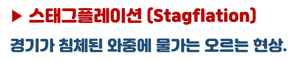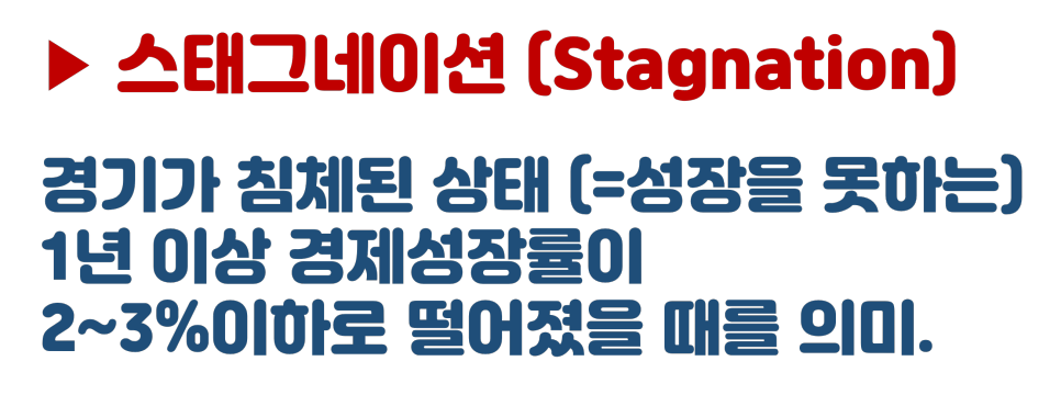 스태그네이션을 '경기가 침체된 상태'라고 할 수 있는데, 이 또한 상당히 경제에 위기를 줄 수 있는 개념입니다.