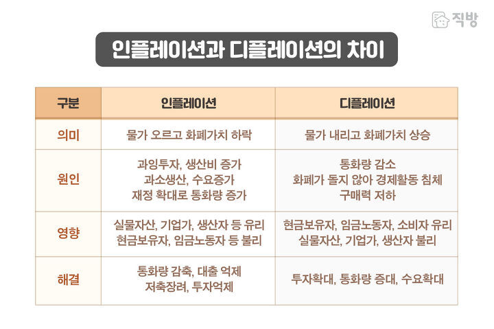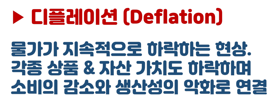정말 간단하게도 딱 인플레이션의 반대되는 말입니다. 바로 물가가 지속적으로, 그리고 의미 있는 수준으로 쭉~ 하락하는 현상을 의미하는 용어입니다.