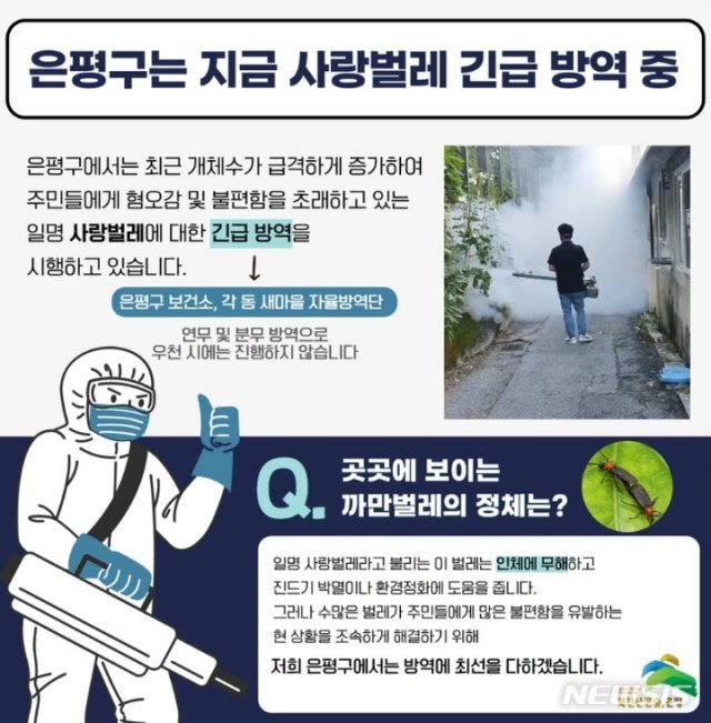 은평구는 “해당 벌레는 진드기 박멸, 환경정화 등 익충으로 알려져있으나 주민에게 혐오감, 미관상 불편을 초래하고 있다”며 “은평구 보건소에서는 자체 방역, 각 동 새마을 자율방역단을 동원해 긴급 방역을 실시 중”이라고 말했다.
