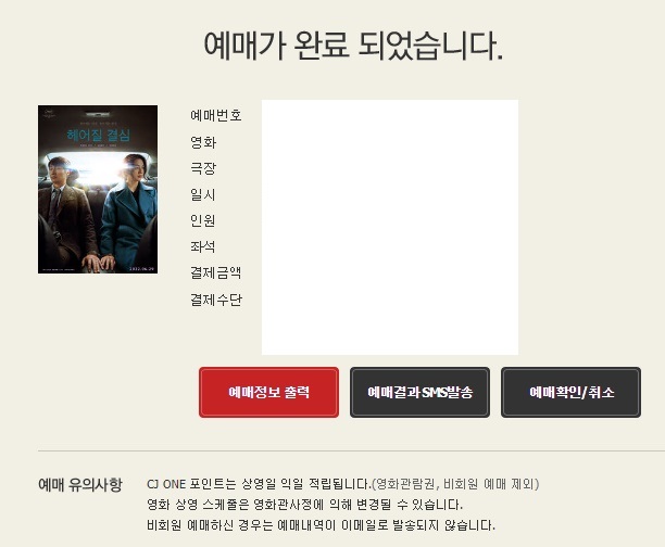 ※ 온라인 예매시 CGV홈페이지/모바일APP/모바일WEB에서 예매 취소가 가능하며 현장에서 티켓 발권시 온라인에서 예매취소가 불가합니다 (현장 매표소에서 취소 가능) <-인터넷에 검색해보니 상영 전에 취소시 수수료 없다고 한다! (홈페이지, 앱, 상영관별로 취소 가능한 시간이 다름. 아래 내용 참조)