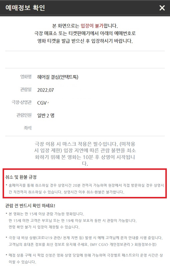 모바일앱/웹 예매 취소는 영화 상영 시작 시간 15분전까지 가능합니다.