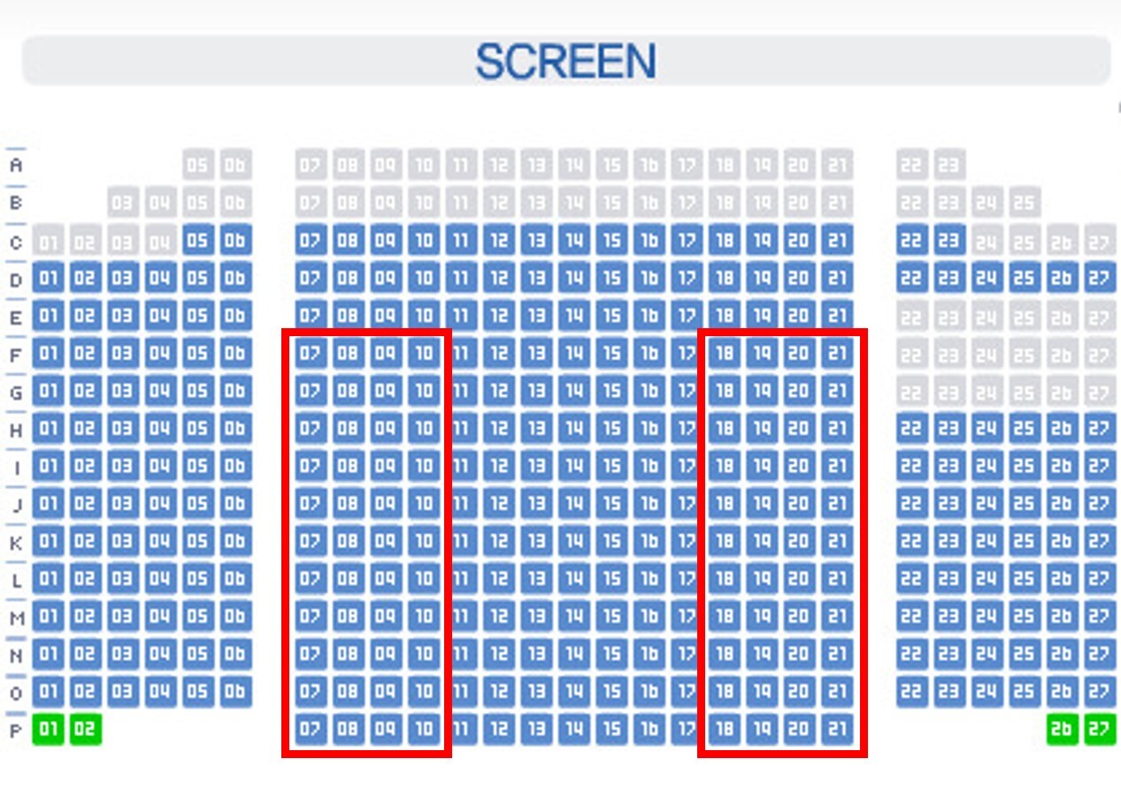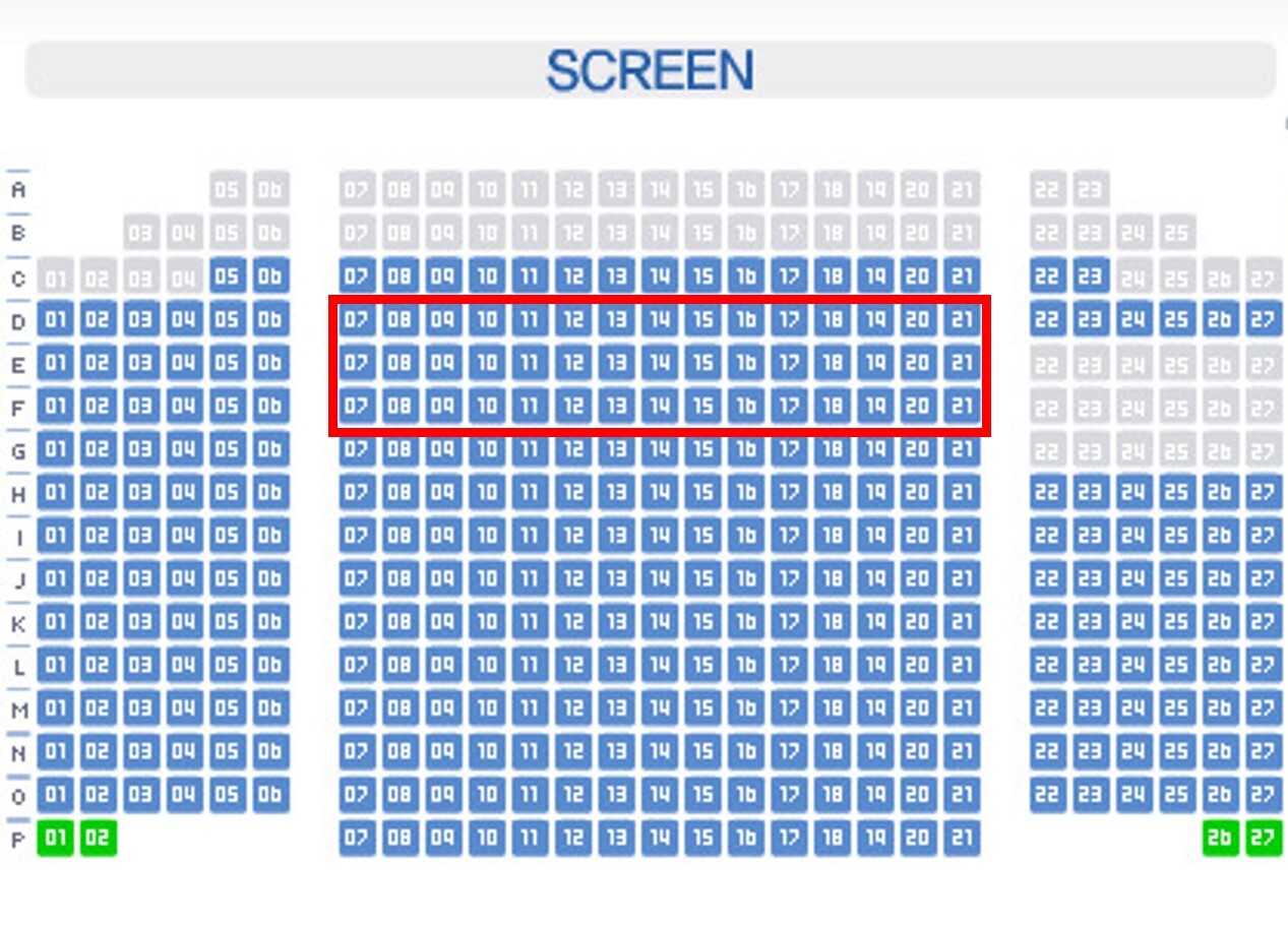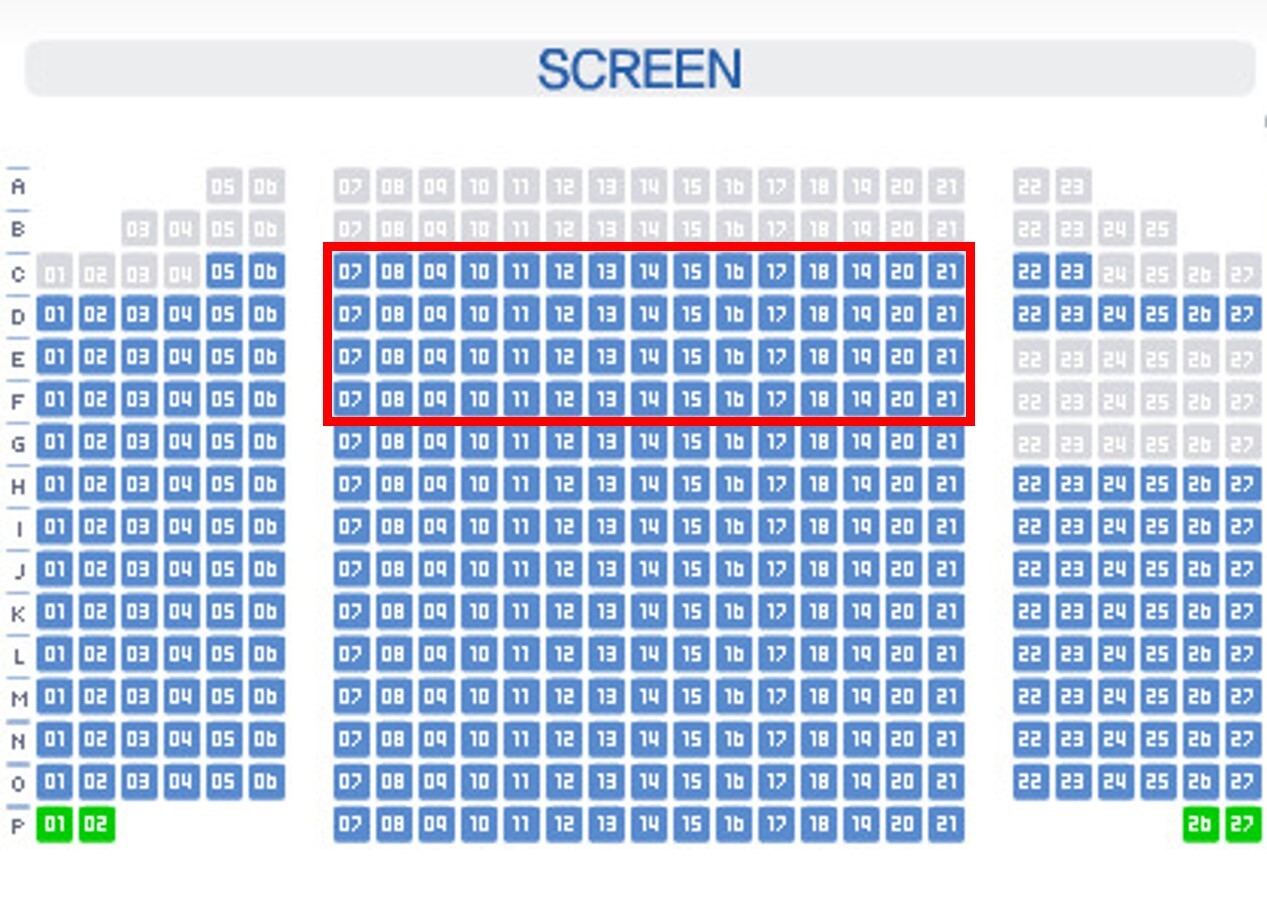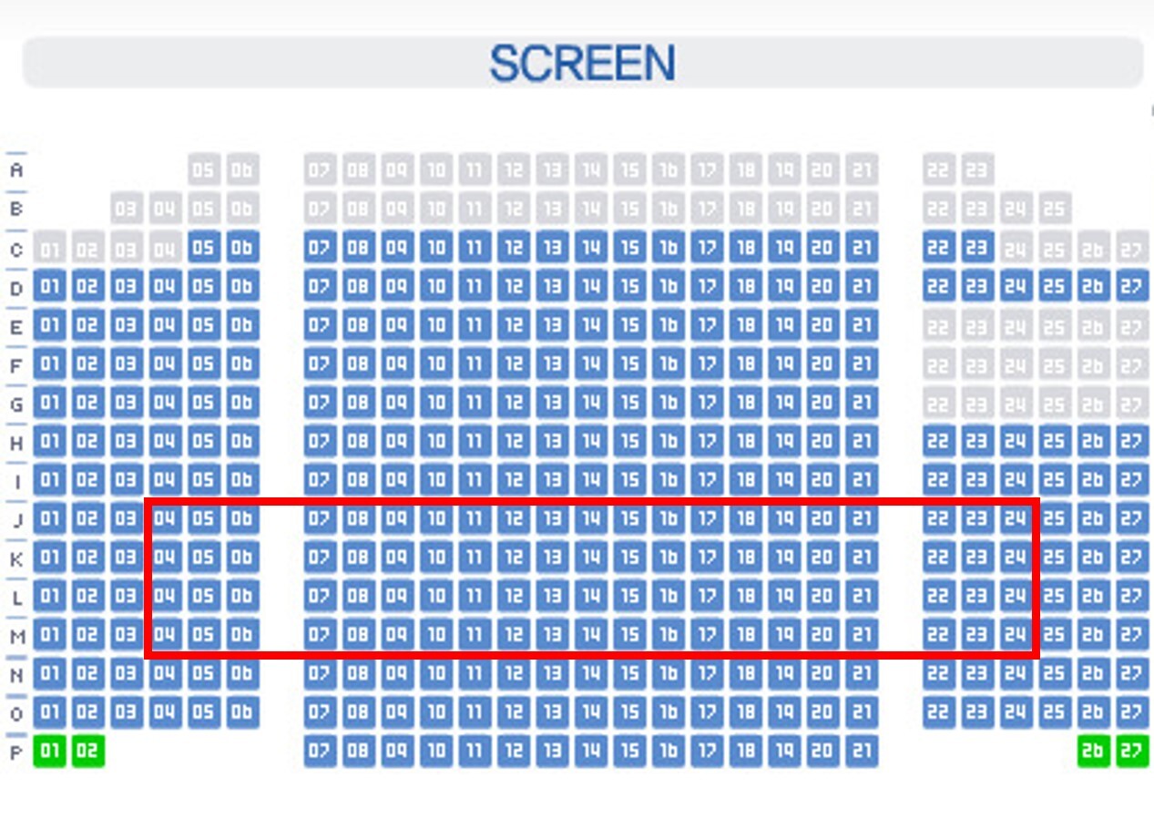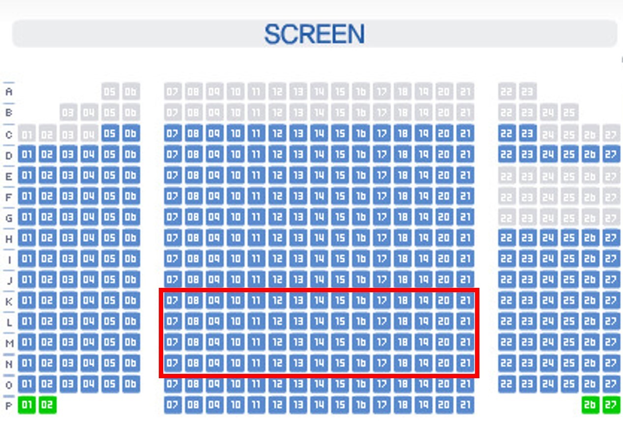 스크린 X ► 뒤쪽 K~N(11~14행) 중앙 좌석