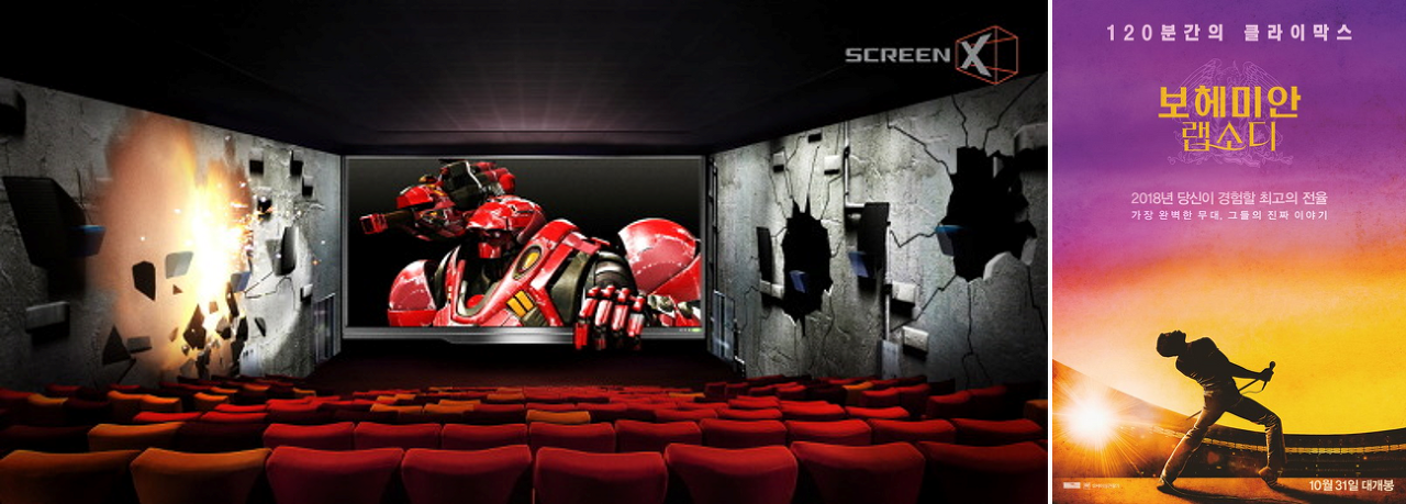 요즘 뜨고 있는 스크린 X는 기존의 정면 스크린뿐만 아니라 양 옆면의 벽까지 3면을 스크린으로 구현하여 관객들의 몰입감을 높이는 상영방식이다. 3면을 사용하기 때문에 훨씬 입체적으로 느껴진다. 이때는 전체적인 화면을 감상할 수 있는 뒷줄 K~N행의 중앙 좌석을 추천한다. 중앙 좌석이 아니라면 좌우 측에 상영되는 화면을 제대로 관람하기 힘들기 때문이다. CG가 가미된 화려한 영상의 액션 블록버스터 영화뿐만 아니라, <보헤미안 랩소디> 같은 영화도 생생한 현장감을 느낄 수 있으니 스크린 X로 보는 걸 추천한다.