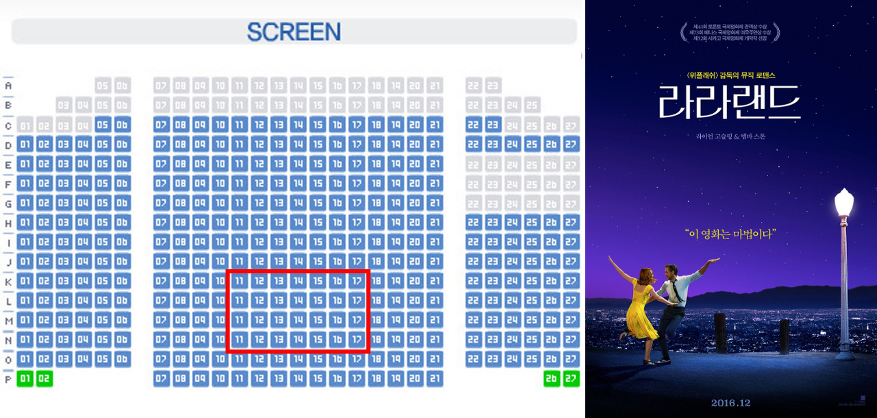 <라라랜드>, <위대한 쇼맨> 같은 음악 영화, 뮤지컬 영화는 다른 영화들과 다르게 음악이 많이 삽입되어 있어 사운드가 중요하다. 영화관의 스피커가 중앙에 위치해 있는 만큼 음향을 더 즐길 수 있는 뒤쪽 K~N행 정중앙 좌석을 추천한다. ‘스위트 스팟’이라고 불리는 뒤쪽 정중앙 자리는 실제로 음향 담당자들이 영화 모니터링 시 사운드를 체크하기 위해 앉는 좌석인 만큼, 제일 생생하고 정확한 사운드를 감상할 수 있다.