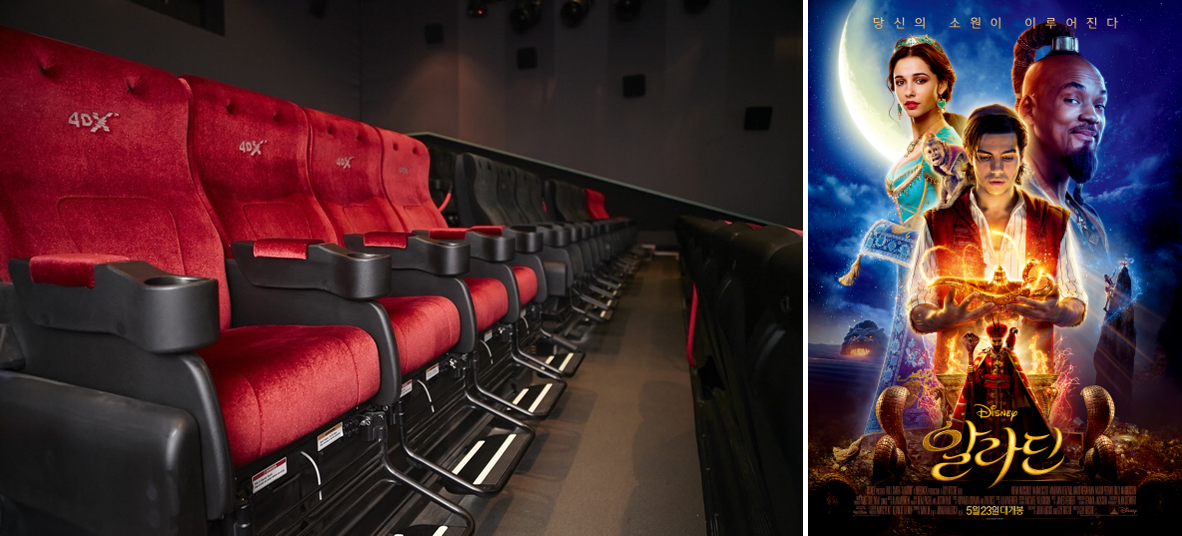 4D는 의자의 움직임, 물 분사, 바람, 조명, 향기 등의 특수 효과를 구현해 오감을 더한 것으로 오감체험 특별 상영관을 뜻한다. 4D는 의자 4개가 같이 묶여서 움직이기 때문에, 움직임이 더 큰 가장 자리 좌석이 특수 효과가 제일 뛰어나다. 특히 4D 상영관은 다른 곳에 비해 스크린 크기가 작아서, 영화의 생생한 입체감을 느끼려면 앞쪽 D~F행에 앉아야 한다. 현재 상영하고 있는 <알라딘>이 4D로 큰 인기를 누리고 있는 만큼, 알라딘으로 입문하는 걸 추천한다.