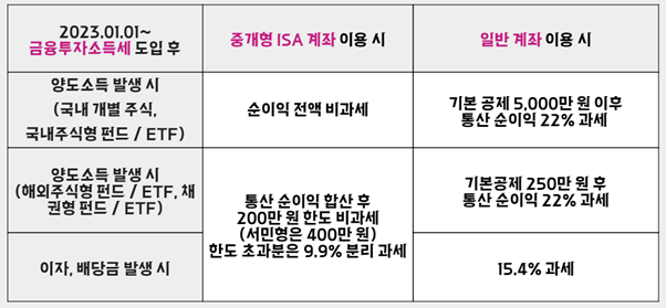 중개형 ISA계좌를 만들 경우, 국내 주식에 대해서는 전액 비과세, 그리고 이외의 상품들도 기존의 22%나 15.4%와 같은 세율 대신 9.9%로 분리과세 할 수 있어 이득이다!