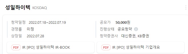 이익미실현 기업 특례(한국형 테슬라 요건)로 상장을 추진해서 상장후 3개월간 환매청구권이 주어지는 곳. 지난 14일 수요예측 결과를 발표했는데 희망공모가(4만700원~4만7500원) 상단을 넘어서는 5만원으로 확정 공모가를 발표했다.