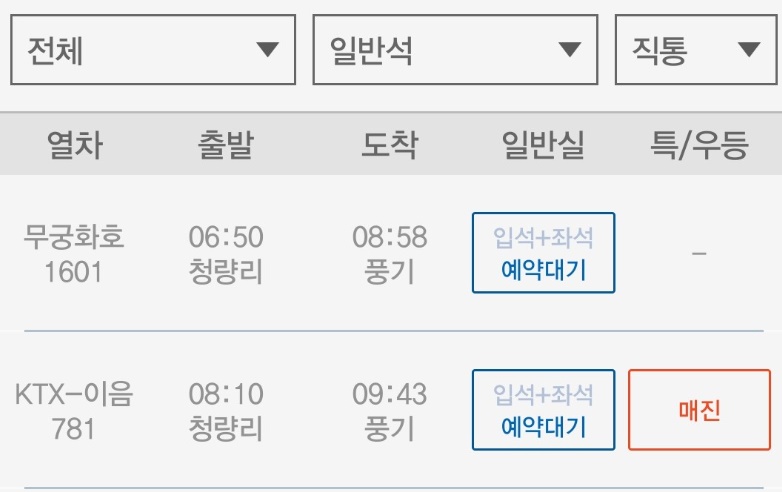 예약대기 시스템은 열차출발 2일전까지 신청이 가능하며, 전에 예약한 사람이 갑자기 일이 생겨서 취소했을 경우 열차 좌석이 생기게 되면 예약대기 신청 순서에 따라 좌석을 배정받을 수 있는 시스템 (만약 취소한 사람이 없으면 입석으로 가야함. 입석좌석은 역 발매창구와 자동발매기에서만 구매 가능, KTX 입석은 서서가는 건데 열차와 열차 사이에 간이좌석이 있는데 이곳에서 앉아 갈 수도 있음.)