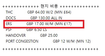 예시1) 운임 1,541.66kg / 0.930CBM이면 Weight가 더 많이 나가니까 여기에 ERS 17을 곱함 = 1.54166 * 17 = GBP 26.21이 됨.