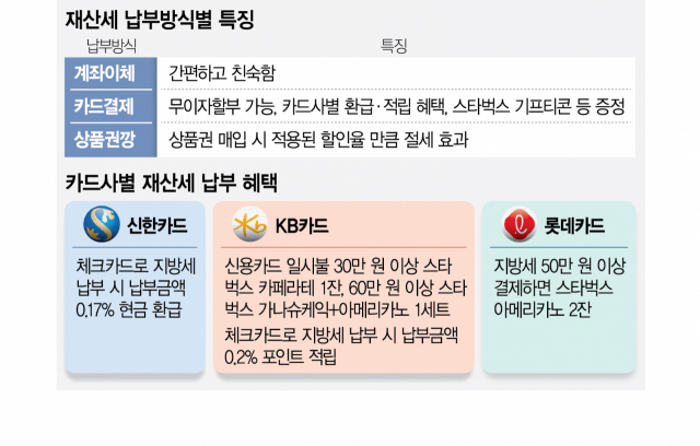 카드사들은 자사 카드로 재산세를 납부하는 고객들에게 경품 증정과 캐시백 혜택도 제공하고 있다. 다만 이 같은 경품‧캐시백 혜택의 경우 거의 대부분 일시불 결제 이용자나 체크카드 결제 고객들에게만 제공된다. 무이자 할부나 경품‧캐시백, 둘 중 하나만을 선택할 수 있다는 뜻. 또한 재산세를 카드로 결제했다고 자동적으로 혜택이 주어지는 게 아니고, 이용자가 따로 이벤트에 응모해야만 경품과 캐시백을 받을 수 있는 경우가 대부분인 만큼 결제 전에 먼저 반드시 이벤트 응모 절차를 확인해봐야 한다. 이벤트에 응모하기 전에 결제해버리면 혜택을 받지 못할 수도 있기 때문!