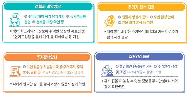 - 주거 안심 동행 : 물건확인 현장동행 지원, 주거환경 점검 및 조언