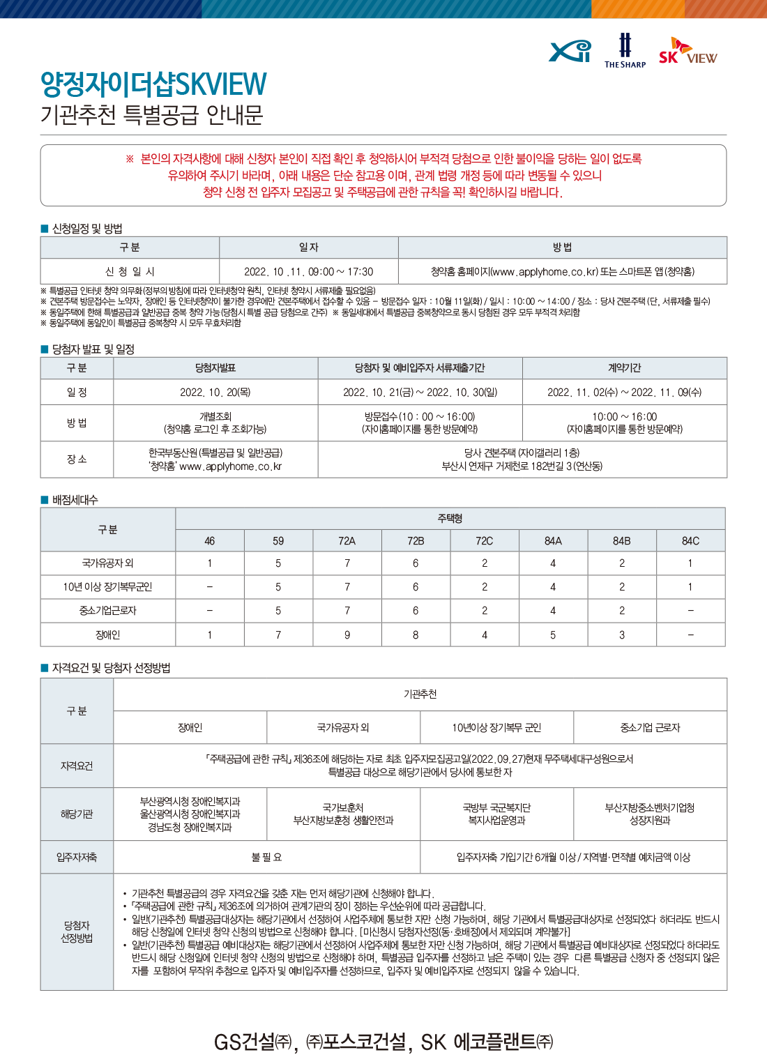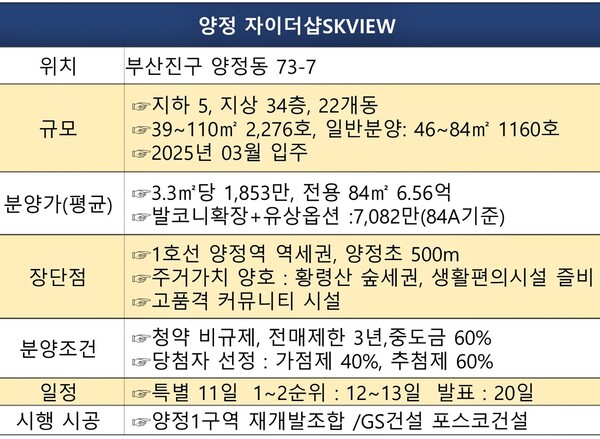 GS건설과 포스코건설, SK에코플랜트 등 3개사가 시공하는 '양정 자이더샵SK뷰'는 부산지역 청약과열지구 해제 이후 첫 청약 비규제 아파트다.