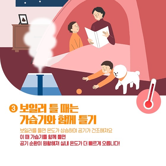 실내에 젖은 수건이나 빨래 등을 널어 두면 실내 습도가 상승하면서 공기 순환이 빨라지게 된다. 이 때 보일러를 가동해야 더 빨리 실내가 따뜻해지고 실내온도도 오래 유지된다. 겨울철 적정 습도는 40~50% 정도다.