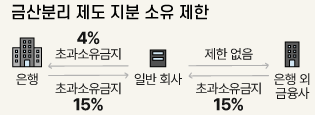 우리나라에선 일반 회사가 은행 지분을 4% 넘게 소유하는 게 법으로 금지돼 있다. (일반 회사가 은행 외의 금융사 지분을 보유하는 건 가능하다). 반대로 은행이나 보험사 같은 금융회사는 일반 회사 지분을 15% 넘게 소유할 수 없다. 또 금융회사는 금융업과 관계없는 사업을 새롭게 시작하는 것도 제한된다. (일부 예외도 존재함 - 신한은행은 ‘땡겨요’라는 배달 앱을 운영 중이고, KB국민은행은 알뜰폰 사업을 한다. 하지만 이런 사업들은 정부의 별도 심사를 통과해야만 시작할 수 있다. 사업을 시작한 뒤에도 2년마다 다시 심사받아야 함)