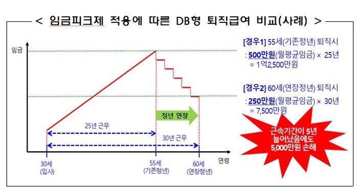 (가령, 만 55세인 C씨가 30년 동안 현 직장에서 계속 근무하고 있고 최근 30일 평균임금이 800만원이라면 현재 퇴직금은 2억4000만원(800만원ⅹ30년)이다. 만약 C씨가 임금피크제 적용을 받아 만 60세에 30일 평균임금이 현재 임금의 50%인 400만원이 돼 계속 근무기간은 35년이 되더라도 퇴직금은 1억4000만원(400만원ⅹ35년)으로, 1억원의 손해를 보게 된다.)