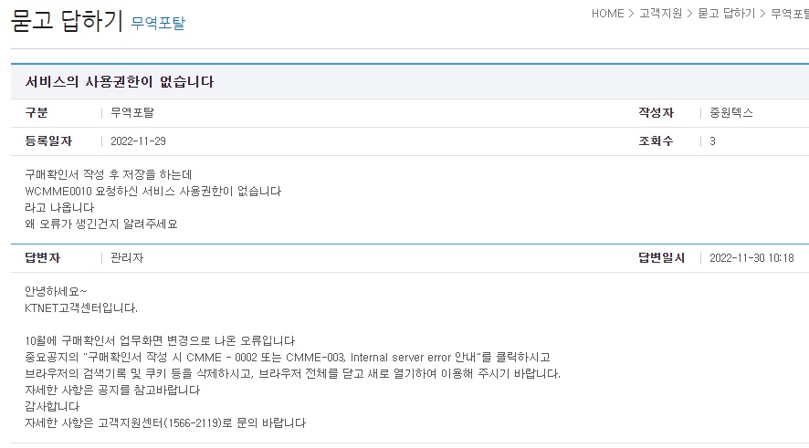 구매확인서 작성 시 CMME - 0002 또는 CMME-003, Internal server error 안내