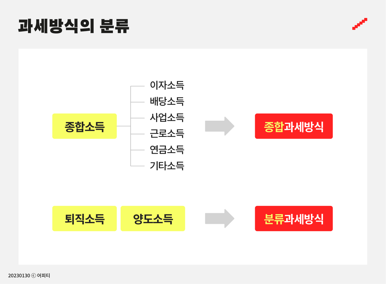 - 양도소득: 부동산, 주식 등을 팔아서 발생하는 차익에 의한 소득
