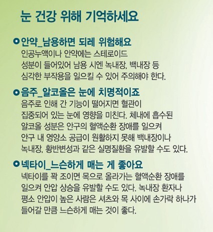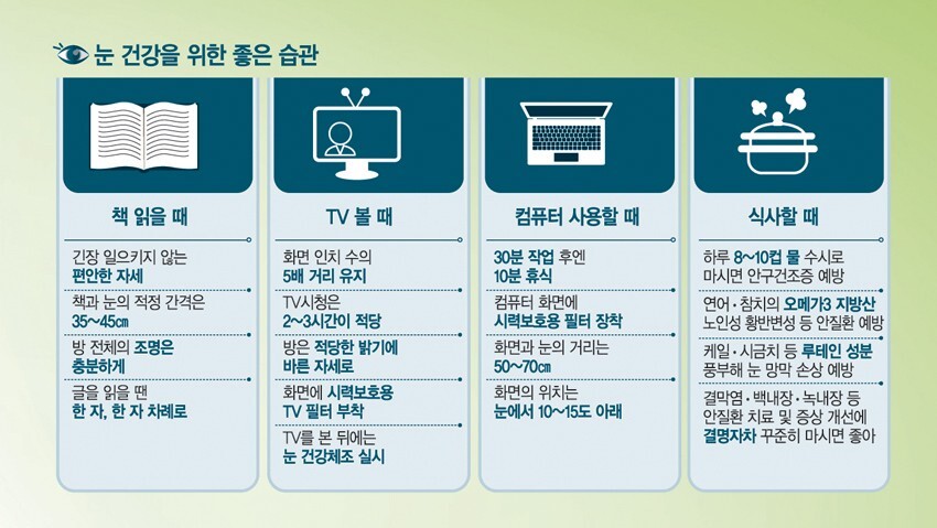 눈 건강을 위해서는 책이나 컴퓨터, 스마트폰 사용 시 눈이 뻑뻑하고 따끔거리는 증상을 느낀다면 즉시 휴식을 취해주고, 책과 모니터의 거리를 30cm로 유지하도록 노력해야 한다. 과일 채소에 많은 비타민과 고기류와 생선에 많은 단백질 등을 충분히 섭취하는 것도 도움이 된다. 특히, 눈의 비타민으로 불리는 비타민 A와 오메가-3, 루테인, 비타민 E, 아연 등의 충분한 섭취는 안과 질환의 발병을 줄이고 진행을 늦춰준다. 눈에 좋은 음식을 알아본다.