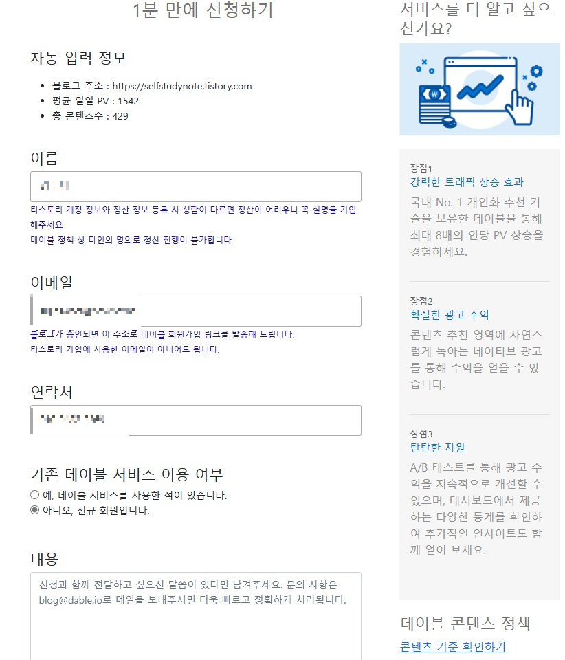 데이블 광고 신청의 길이 아주 멀고 험했다... (일평균 방문자수 1500명 넘는것부터가 힘들었음ㅠㅠ) 데이블 광고 신청 기록은 아래 포스팅에서 참고해주세요. 티스토리 데이블 (Dable) 신청했다! (t