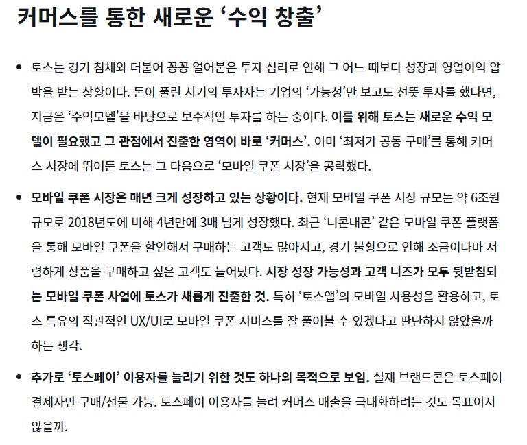 토스는 통신판매중개업자로 브랜드콘 사업을 영위하고 있다. 토스가 상품권을 직접 발행해서 판매하는 형태는 아니지만 중개업체 콘사와의 제휴를 늘리면 제품 구색을 얼마든지 추가할 수 있다. 상품을 직접 매입하거나 재고를 보유하지 않고도 '배송지 입력' 방식으로 기성품을 취급할 수 있다.