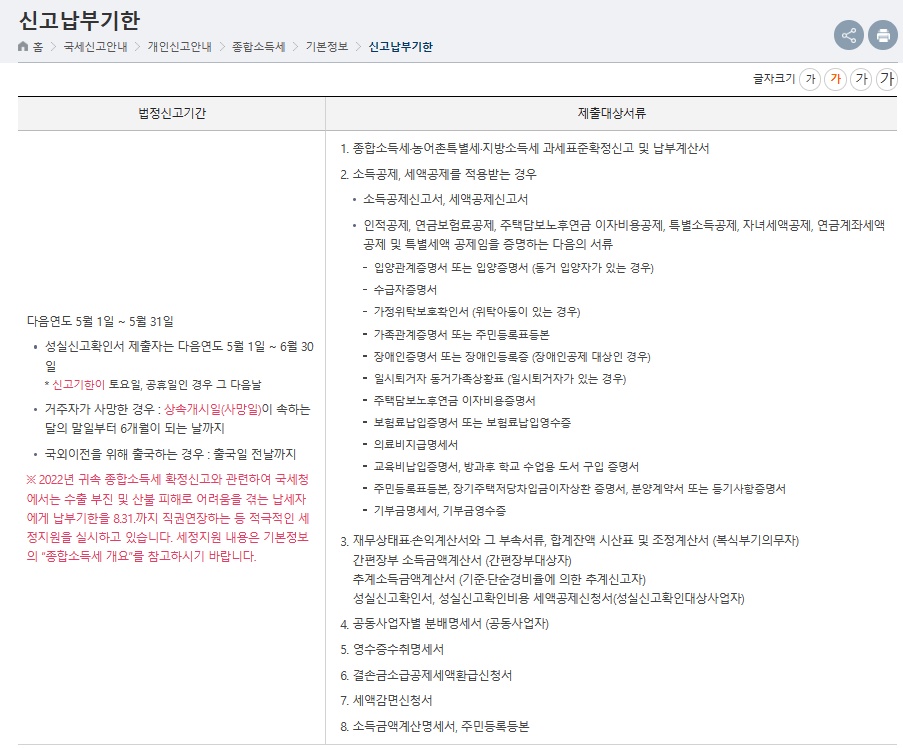 국세청>국세신고안내>개인신고안내>종합소득세>기본정보>신고납부기한 (nts.go.kr)