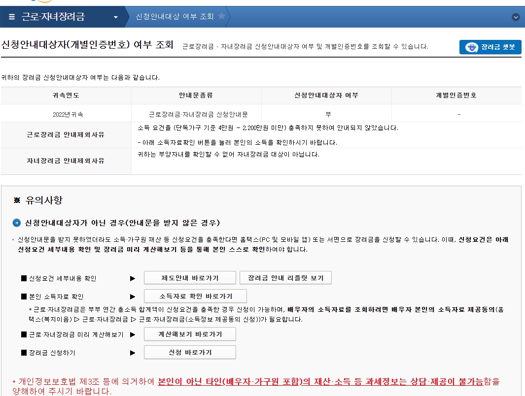 근로 자녀장려금 신청안내대상 여부 조회