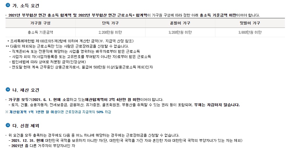 정기 근로자녀장려금 신청자격은 단독가구 총 소득 2200만원 / 홑벌이가구 총 소득 3200만원 / 맞벌이가구 총 소득 3800만원 이하여야 한다. 재산은 2억 4천 이하여야 한다.