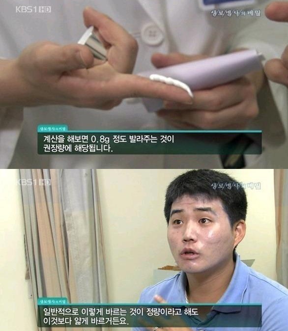 선크림 양 : 효과를 제대로 얻고 싶다면 어떤 형태의 제품을 사용하던지 상관없이 적정량을 써야 한다. 세계보건기구(WHO)가 정한 자외선 차단제 권고량은 2㎎/㎠으로, 여성 얼굴의 경우 대추 한알 정도의 분량을 골고루 꼼꼼히 바르면 권고량이 충족된다. 성인 평균 얼굴 크기 기준 손가락 두 마디 분량 짜서 바르기 (이래도 되나 싶을 정도로 조금 많게 바르기)