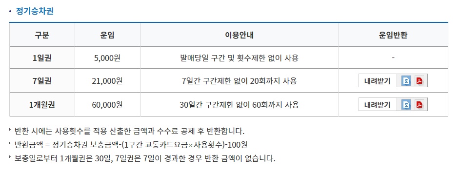 ※ 반환금액 : 정기권 운임(45,000원)-1구간 카드운임(990원)×사용횟수-수수료(100원)