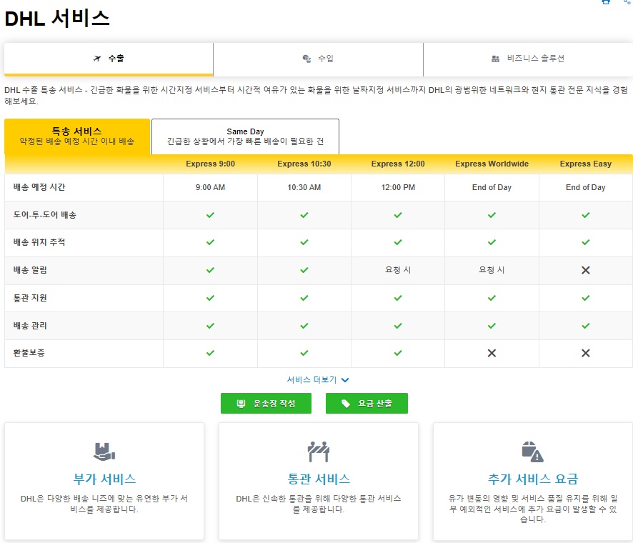 부가 서비스, 추가 서비스, 픽업 및 배송 옵션 (express.dhl)