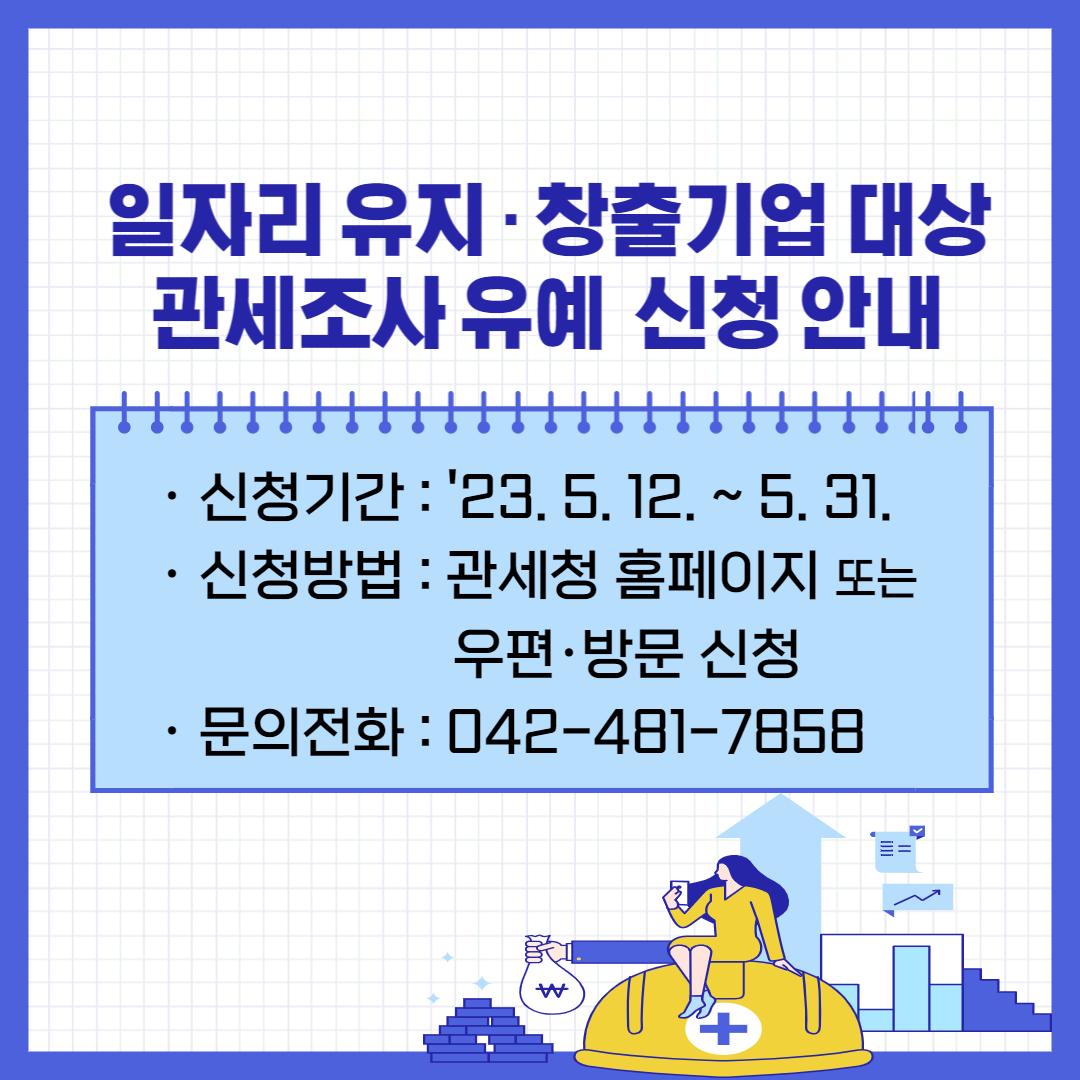 관세청은 일자리 유지 및 창출기업에 대한 관세조사를 유예하기 위해 ’23년 5월 12일부터 20일간 신청서를 접수할 계획입니다.