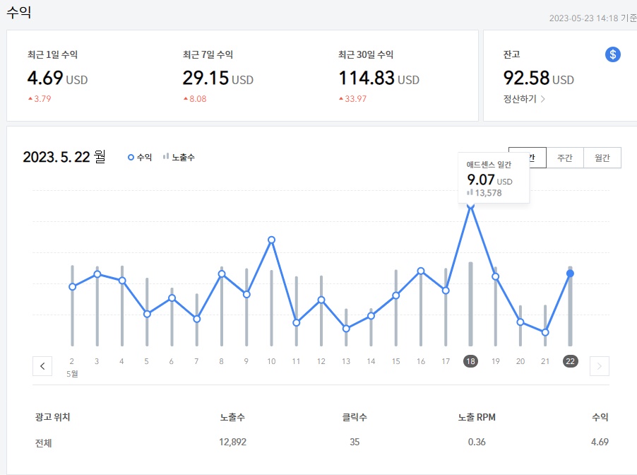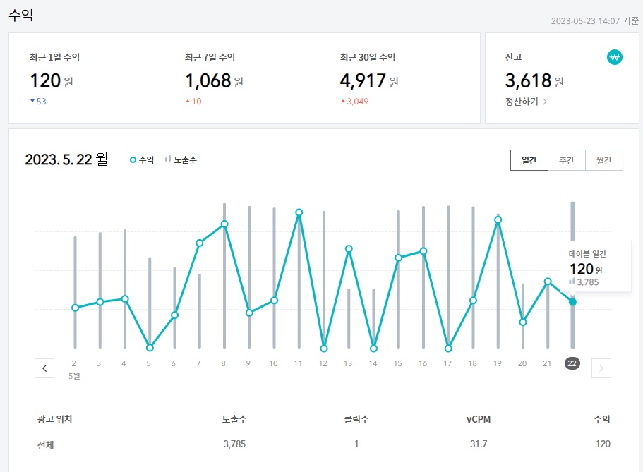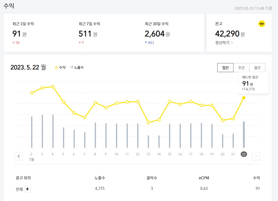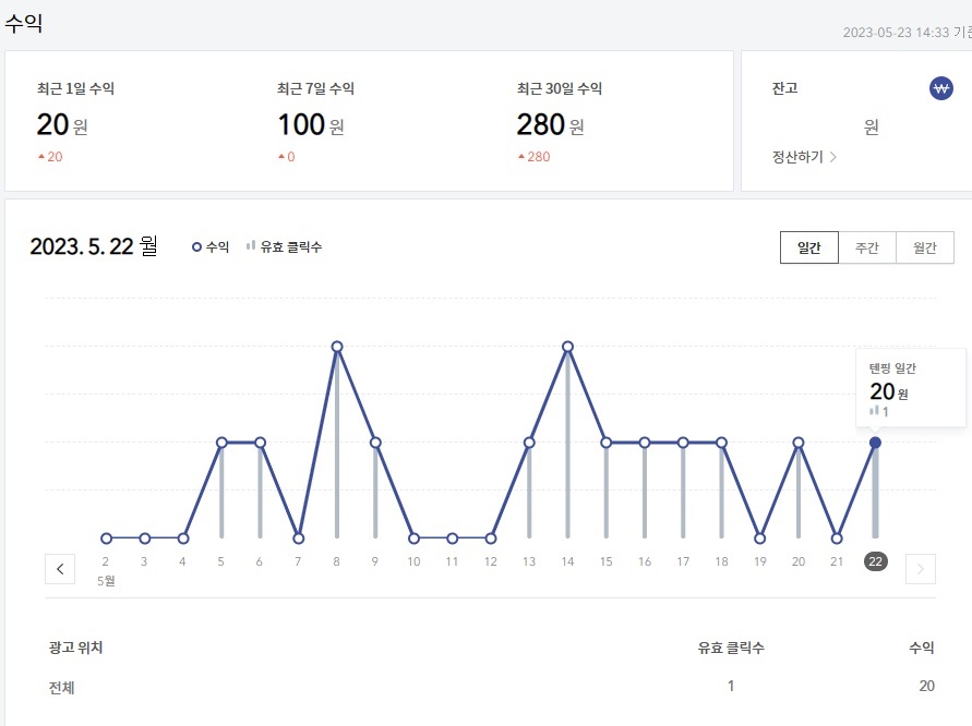 정산도 오만원부터 가능해서 푼돈 매일 모으고있다......잔고 5만원 넘기면 정산하고 광고 빼야지...