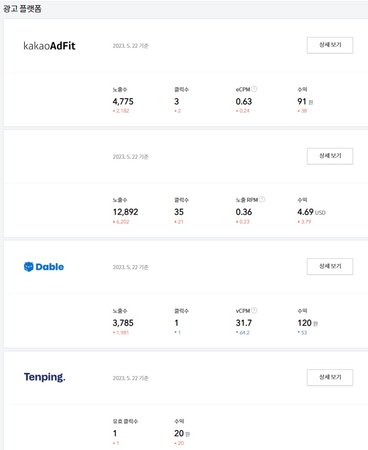 광고 수익 시험해본다고 카카오애드핏(kakaoAdFit), 구글 애드센스(Google Adsense), 데이블(Dable), 텐핑(Tenping)까지 다 달아봤는데 수익은 애드센스>데이블>카카오애드핏>텐핑 순이었다.