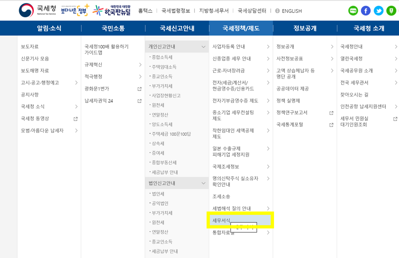 국세정책/제도 탭 > 세부서식 > 소득세 감면신청서 검색하여 다운로드 받기