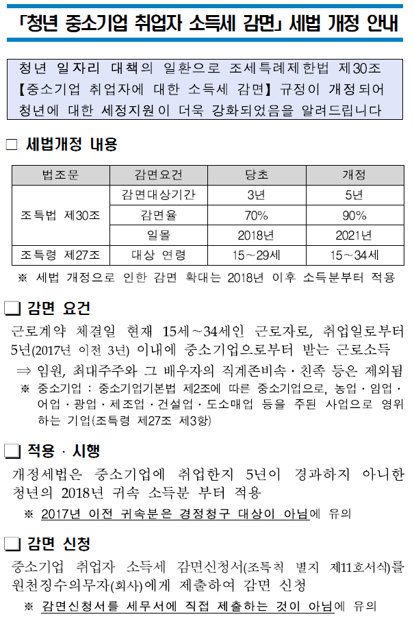 중소기업의 취업을 활성화 하고, 청년층과 노년층, 장애인과 경력단절 여성의 취업을 장려하기 위해 해당 대상자의 소득세를 감면해주는 제도로 중소기업에 취업한 청년에게 5년간 최대 90%까지 소득세를 감면해준다. 감면되는 한도 금액은 최대 150만원!