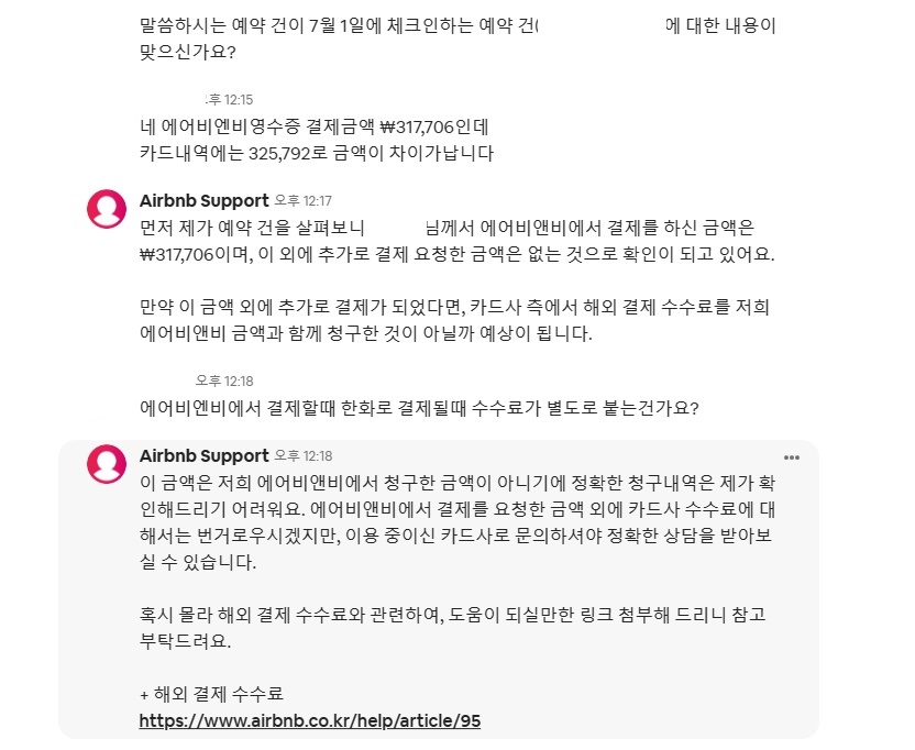 최근에 에어비앤비에서 숙소를 예약했는데 영수증에 나온 금액과 카드결제내역에 나온 금액이 달랐다. 그래서 에어비앤비 고객센터에 상담을 했다.